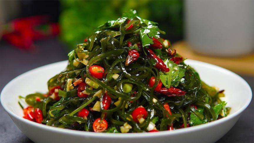 2、锅里水烧开,加一点白醋,白醋可以让海带吃起来更爽口。下入海带焯水,然后捞起过一下冷开水,沥干水分后,加盐、白糖、小米辣,蒜末,生抽和香醋以及葱花。