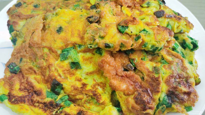 2、油热以后下入虾皮,炒出香味,下入韭菜炒软以后,倒入打散的蛋液,用小火把底部煎至定型了,再翻过来,把两面都煎至定型,再翻炒成小块。最后淋入一点生抽提鲜,翻炒几下就可以出锅啦。
