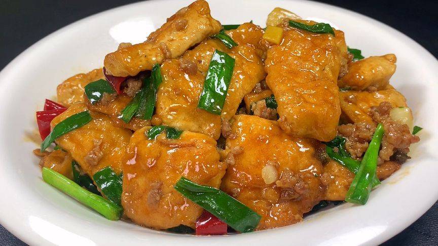 3、豆腐泡好后倒入漏勺控干水分。油热后把豆腐开小火慢煎。煎至两面金黄后,先将它盛出来。把肉末放入锅中炒散,炒至变色。肉末炒香后,把姜、蒜、干辣椒、花椒放进来炒香。把煎好的豆腐放进来,翻炒几下,倒入料汁,开大火快速的翻炒入味。再把韭菜放进来炒至断生,就可以出锅了。